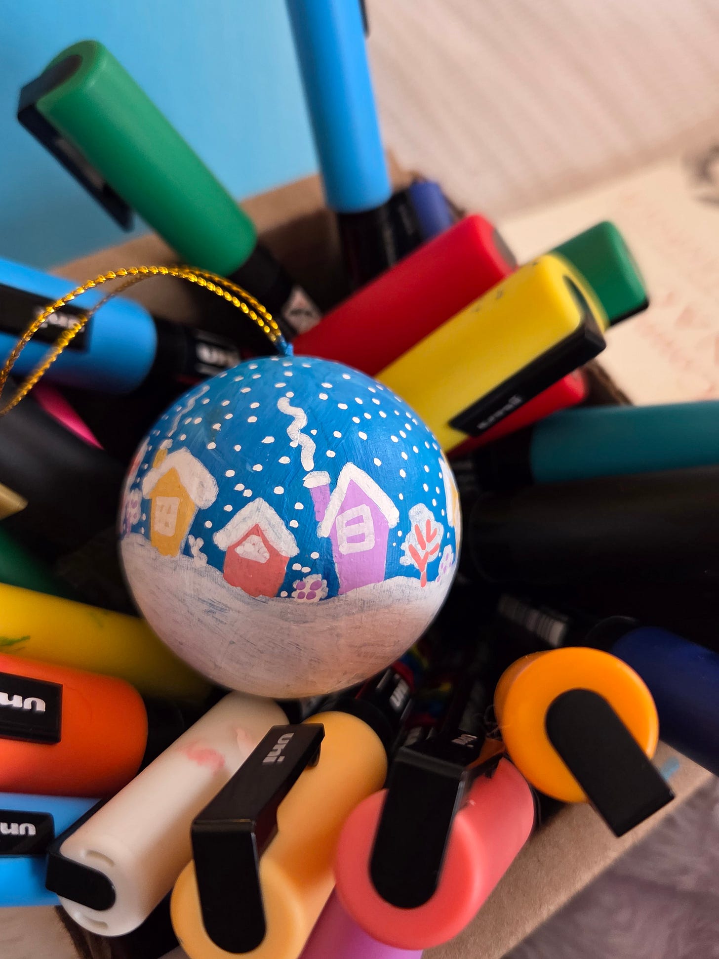 Best of all, the time and energy I saved from multiple shopping trips and wrapping many small gifts meant that we could spend more family time together doing puzzles and watching weekend football games. I was able to bake goodies and make gift bags for 14 friends and neighbors, and deliver surprise candied pecans, sugar cookies and chocolate orange peels to family members before the 25th. And I even had enough time and energy left to try drawing on paper mache and wood slice ornaments in the last week, which I discovered I loved.
